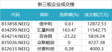 信中利(833858.NEEQ)今日成交1.29亿元,居成交额榜首。汇量科技(834299.NEEQ)、百合网(834214.NEEQ)分别成交1.15亿元、5,839万元。