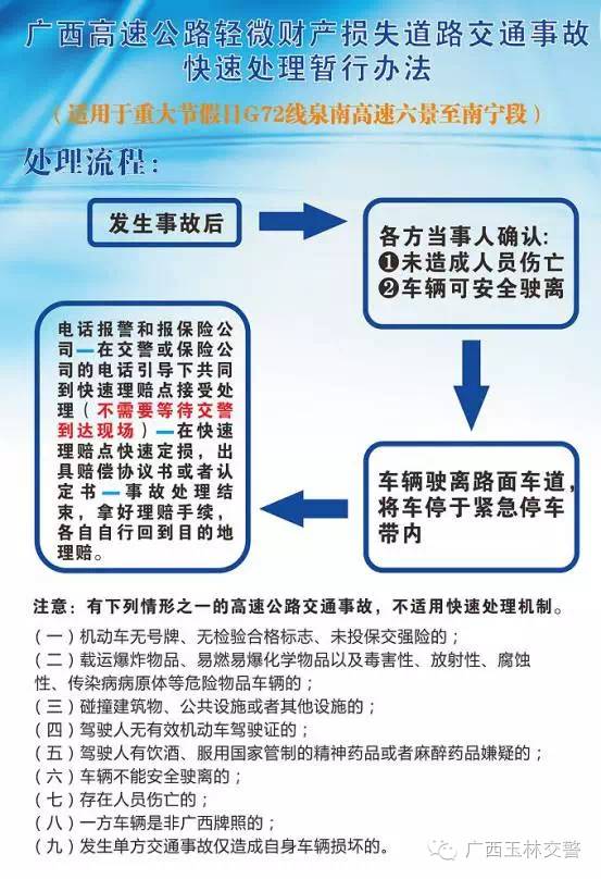 还在为等待高速路上漫长的事故处理程序发愁吗?那你就out啦!9月30日,,在G80广昆高速玉林兴业至岑溪路段正式启动。事故车辆快速撤离、定损、完成理赔,一套事故快速处理流程将为国庆假期出行的车主增添保障。