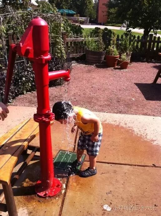 在美国,公共场所有不少允许小朋友玩儿的喷水池,喷水乐园和水泵。对小朋友来说,这就是他们的水上乐园啊,又开心又过瘾,还为孩子提供了小小的社交机会。