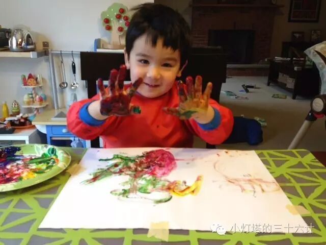 小朋友画画其实就是玩颜料,所以不少妈妈如临大敌,深怕孩子把衣服、家具、桌布等弄脏了。其实现在基本各种水彩、画笔、印泥、手指画颜料都有可洗的(washable),画纸也有不渗水的,所以选择合适的材料,就可以让小朋友尽情地折腾了。
