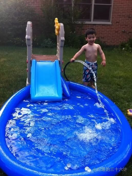 空间再大些可以考虑小泳池,对于不真正游泳的小小朋友来说,小泳池基本上就是一大浴缸。有的小泳池自带充气小滑梯,但是自带滑梯一般都鼓鼓囊囊不太顺,最最最过瘾的,是把普通的塑料小滑梯架泳池边上,一沾水就特别滑溜。