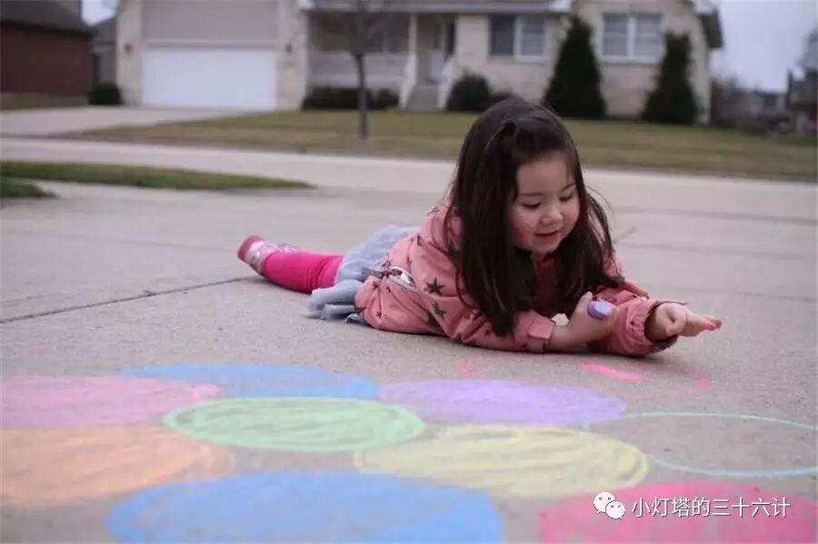 在地上画粉笔画,孩子的想象力和思维不受画纸大小限制,通过对大色块的运用,他们可以画出很多有趣的图案。如果爸爸妈妈也一起加入,小朋友会更开心,这是你们共同的努力成果呢。