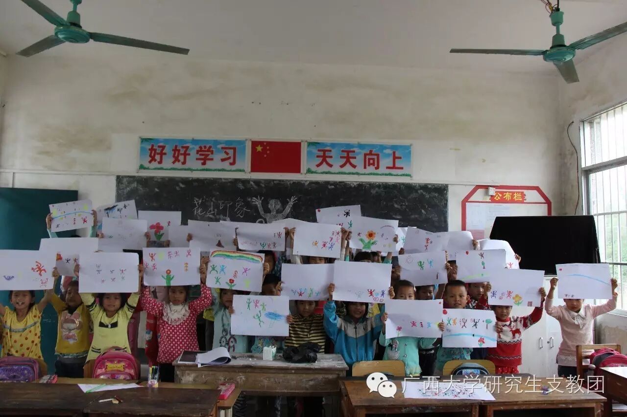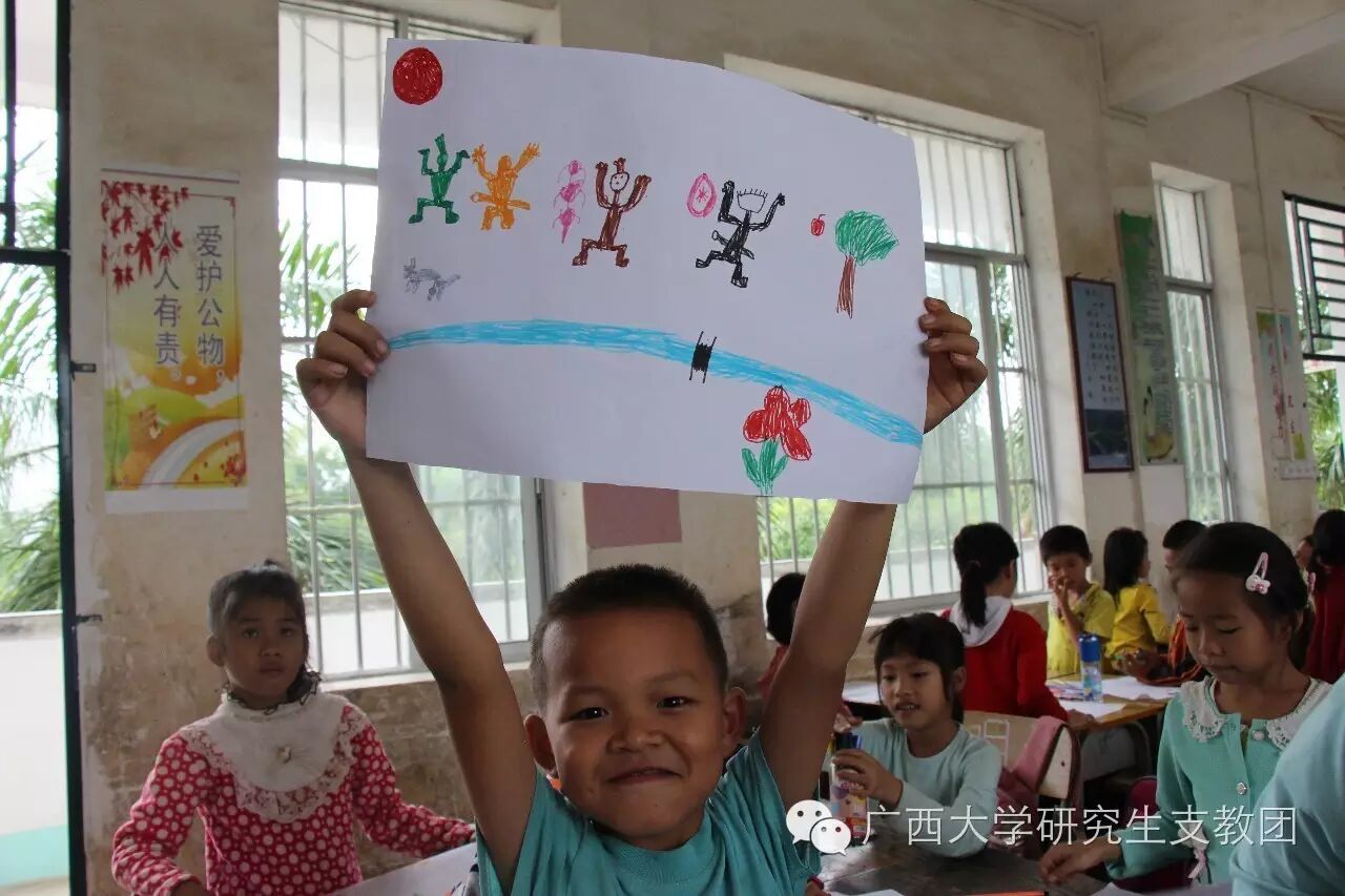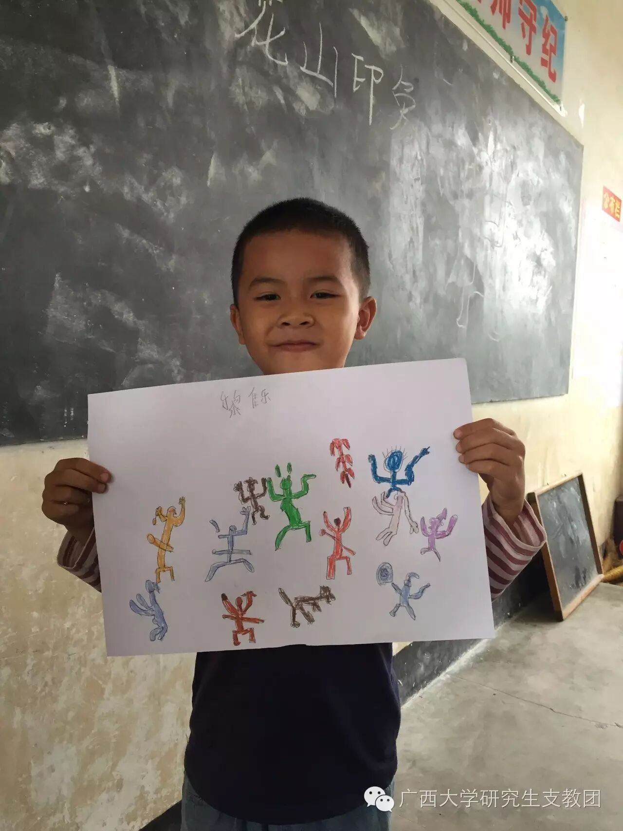支教团成员分别为一年级、二年级的小朋友们开展特色课堂,队员们将事先准备好的花山图片展示给孩子们看,调动他们的丰富想象力让他们去联想花山壁画上的来源。很快孩子们就做出的积极的回应,有说是天上的神仙画的也有说是外星人刻画上去的,孩子们天马行空的想象力让整个课堂充满了欢声笑语。