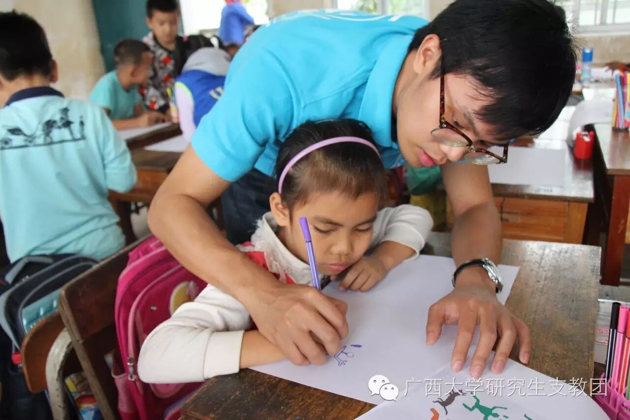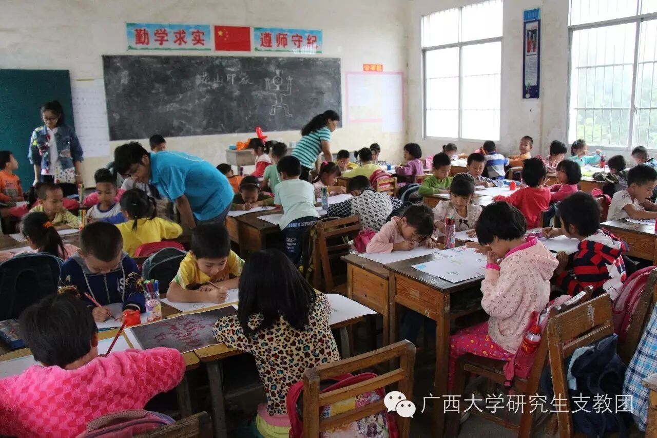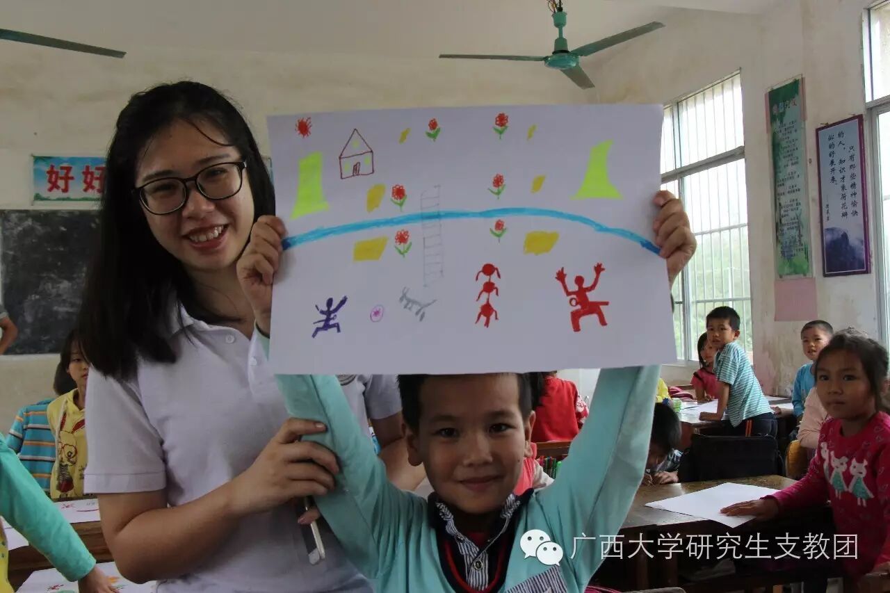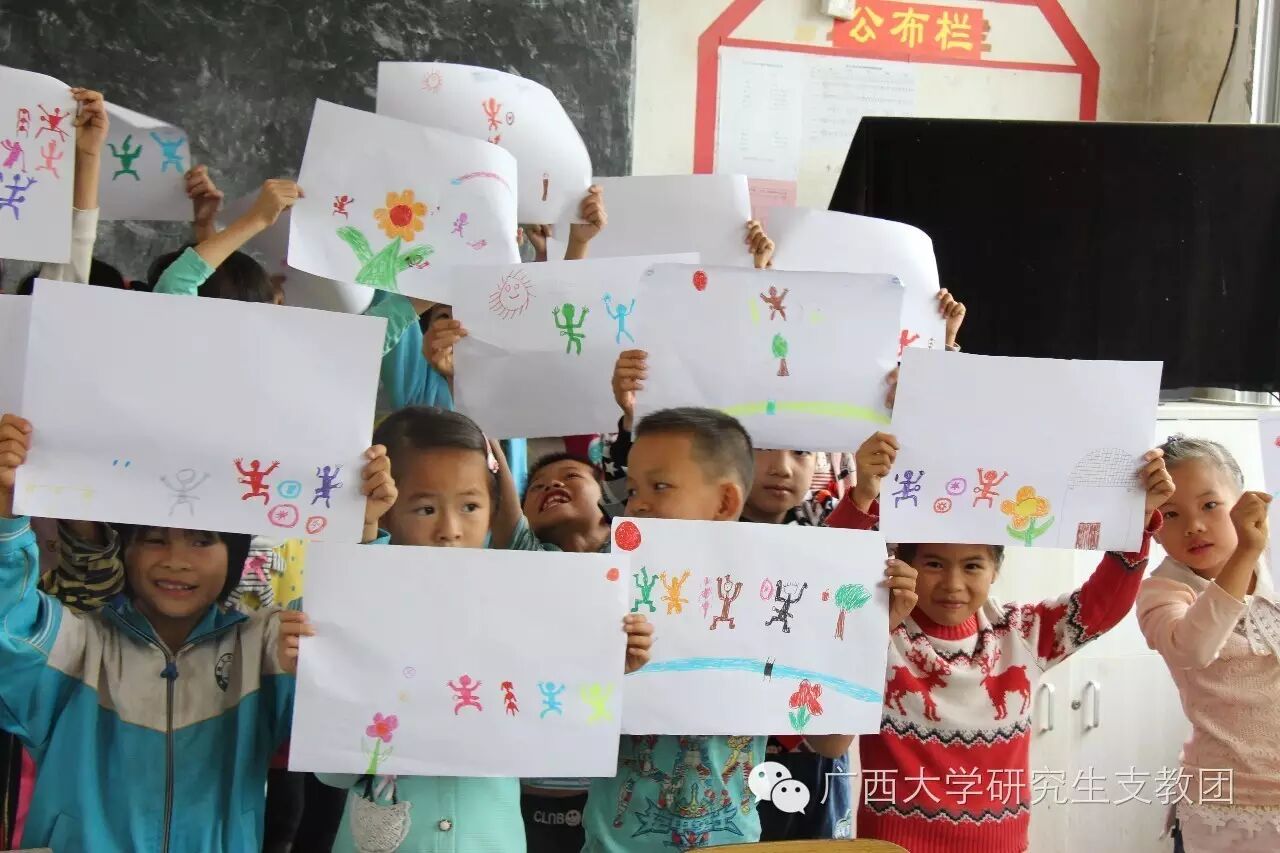 支教团成员分别为一年级、二年级的小朋友们开展特色课堂,队员们将事先准备好的花山图片展示给孩子们看,调动他们的丰富想象力让他们去联想花山壁画上的来源。很快孩子们就做出的积极的回应,有说是天上的神仙画的也有说是外星人刻画上去的,孩子们天马行空的想象力让整个课堂充满了欢声笑语。