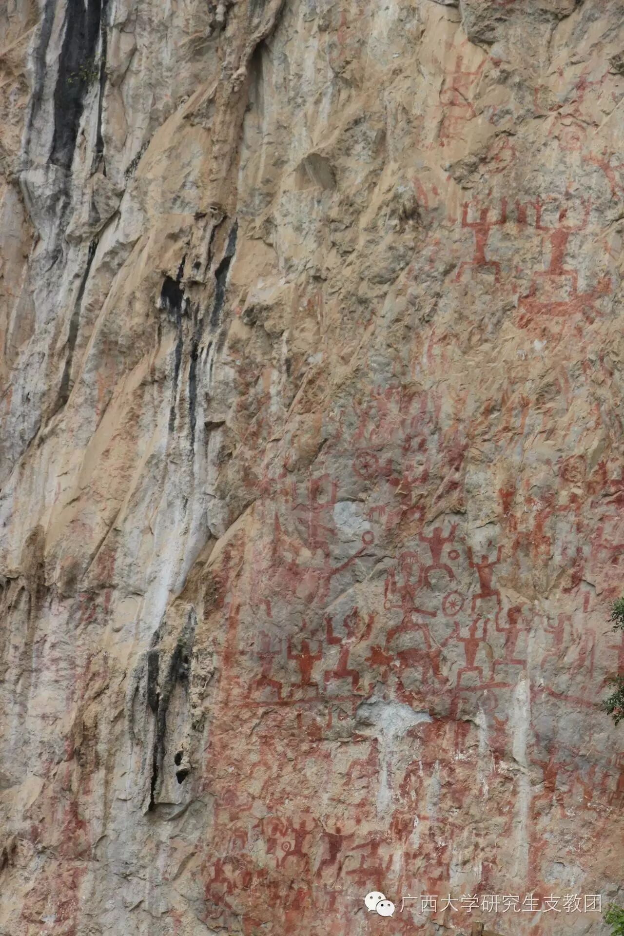 ⊙这些壁画,以人物为主,间有铜鼓、铜钟、刀剑等器物和马、狗等动物形象。据考证,这些壁画是壮族先民创作的,成画年代约在2000多年前。