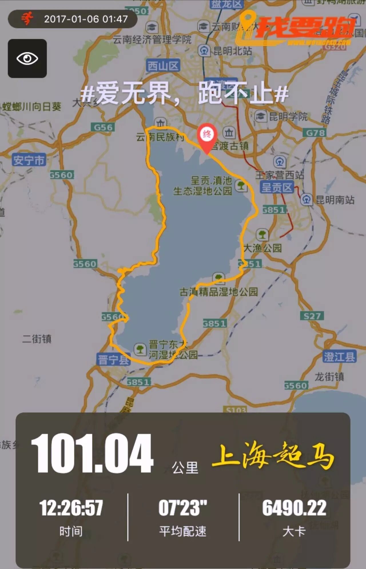 简介:2017年1月6日,上海超马创始人Aris与公司设计师九爷在无保障车的情况下,耗时12小时完成了环滇池的跑步,一场属于90后的100公里环湖超马,在爱的陪伴下完成。