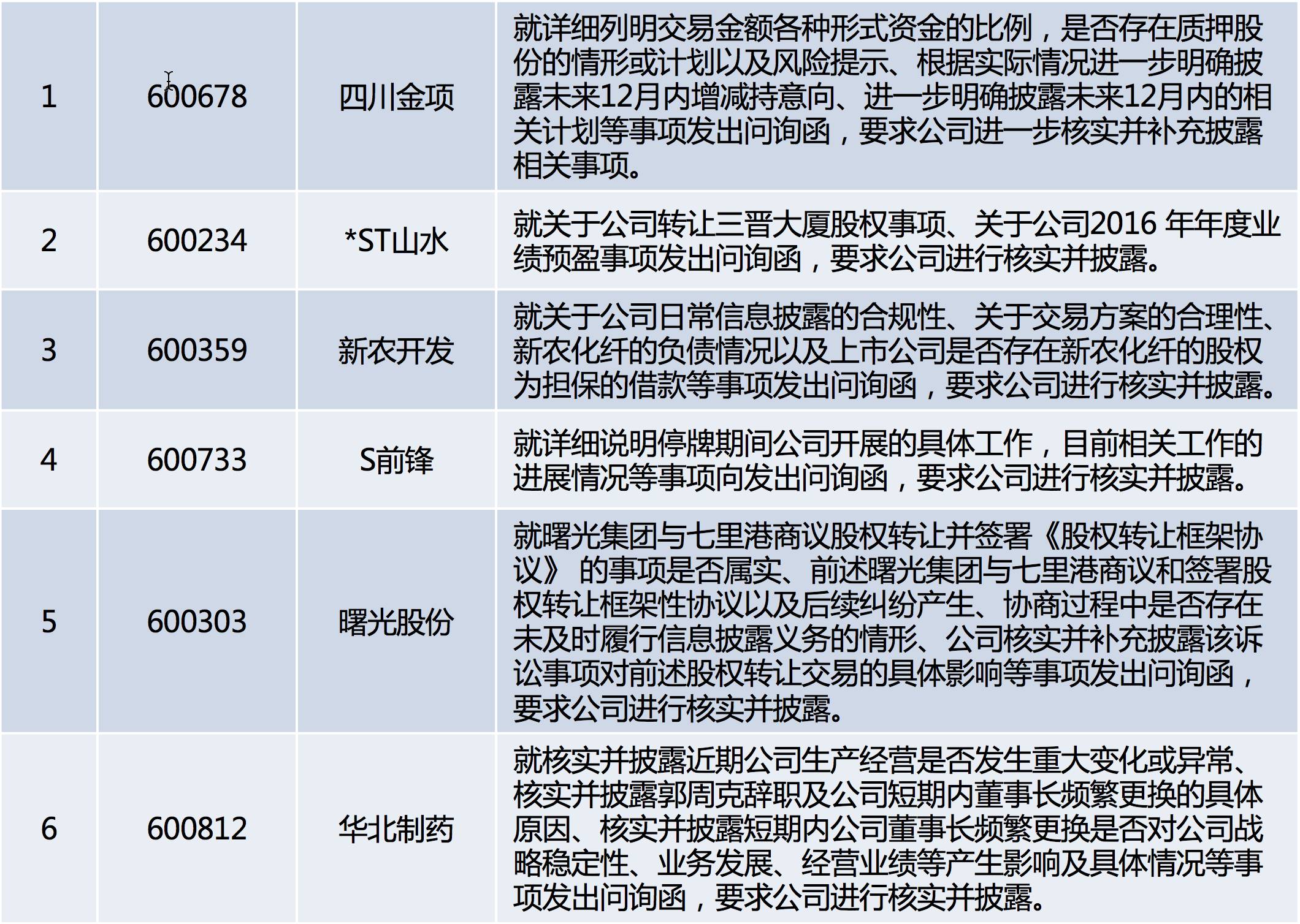 针对公司控制权纠纷、公司股权转让股权的合法合规性、终止重组进程、高溢价收购标的公司、交易核查中存在异常交易账户、终止向子公司提供财务资助和资金占用、承诺履行情况、筹划非公开发行停牌前及高比例送转预案披露前出现异常交易、公司重大传闻、投资者投诉等事项,本所以发函等方式向 19 家公司进行问询和关注,要求其就有关问题进行核实并及时履行信息披露义务。