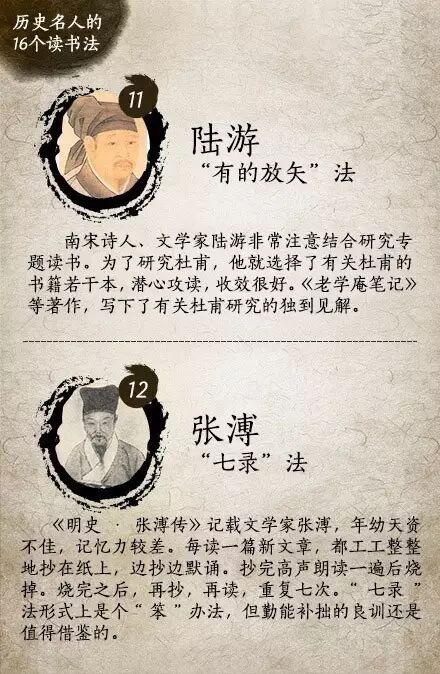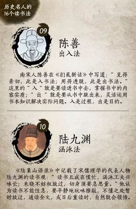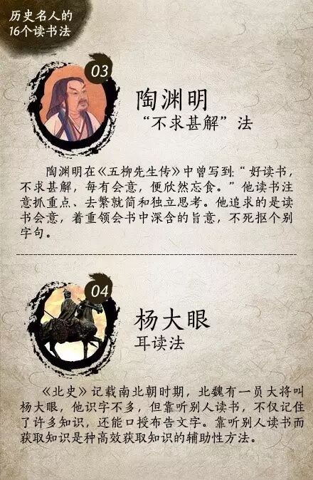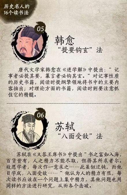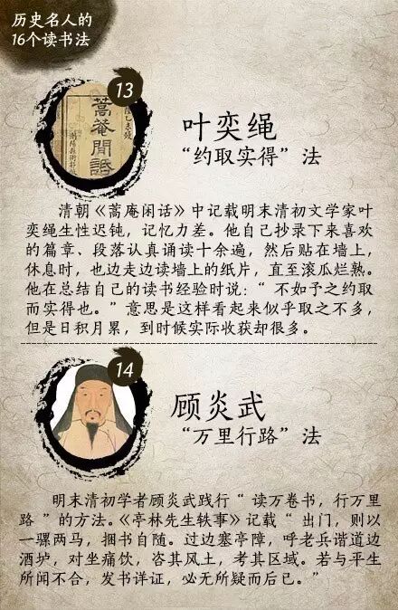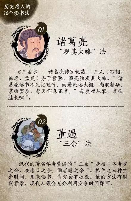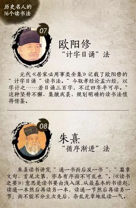 先贤鸿儒大多手不释卷。诸葛亮读书“观其大略”,与陶渊明的“不求甚解”异曲同工;北魏将军杨大眼认字不多,却靠听人读书长了知识;欧阳修的“计字日诵”教你积少成多;明代张溥“七录”法是好记性不如烂笔头的最佳实践……