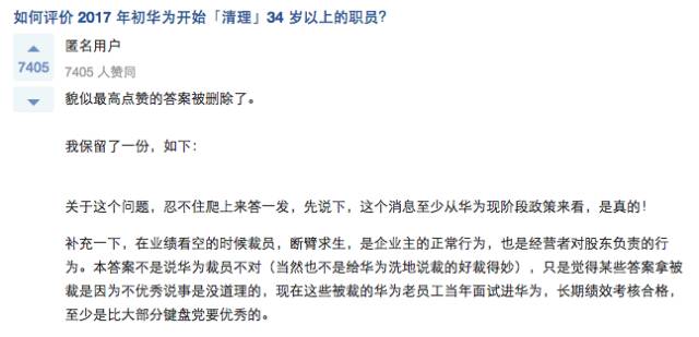 前一段时间,一篇题为《我那么努力,到底哪里出了问题?》的帖子同样在网络上疯传,作者自称是“深圳某知名通讯公司”的员工,因考虑到家庭情况不愿意出国,而被HR劝退。这篇文章中提到的情况,和此前曝出的“华为清退34岁以上员工”的新闻不谋而合。