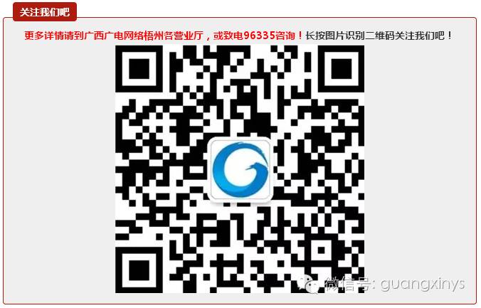 更多详情请到广西广电网络梧州各营业厅,或致电96335咨询!长按图片识别二维码关注我们吧!