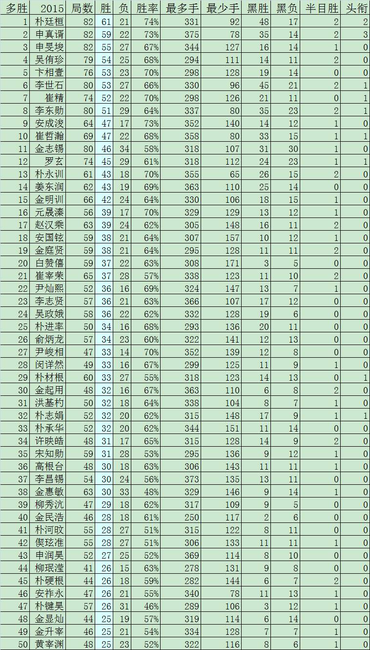 另外,2015全年韩国多胜榜上,朴廷桓61胜排名榜首,申真谞59胜位居第二,申旻埈55胜列第三,女将吴侑珍54胜高居第四,卞相壹李世石53胜,崔精52胜,李东勋51胜,安成浚崔哲瀚47胜,金志锡46胜,罗玄45胜,朴永训姜东润43胜。吴政娥、朴志娟、金惠敏等女将也跻身多胜榜50强,韩国棋战减少、女子联赛增加女棋手对局是原因之一。(李新舟)