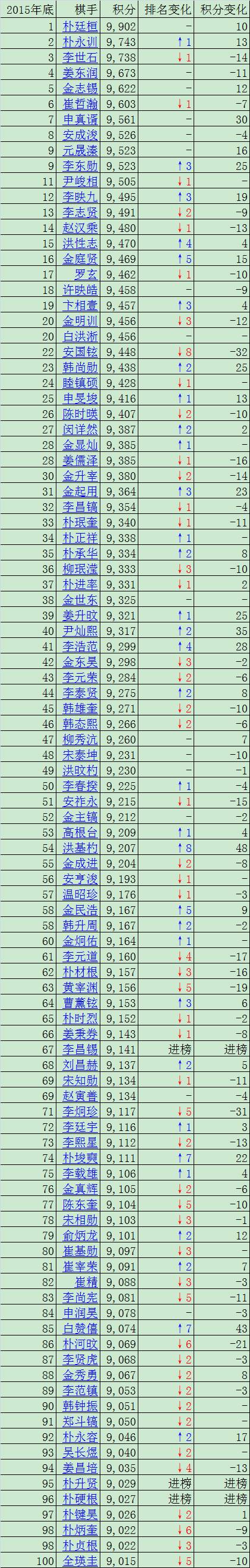 近日,韩国棋院公布了截止2015年底的韩国职业棋手等级分排行榜,22岁的朴廷桓连续26个月、第35次排名第一,即将追平李世石连续27个月领跑的纪录。朴永训5分优势超过李世石。2015多胜榜朴廷桓申真谞申旻埈位居三甲,女将吴侑珍仅以1个胜局优势力压李世石高居第四。