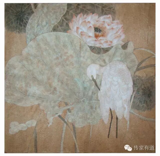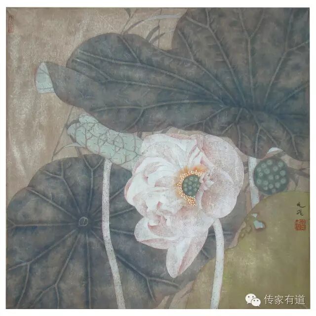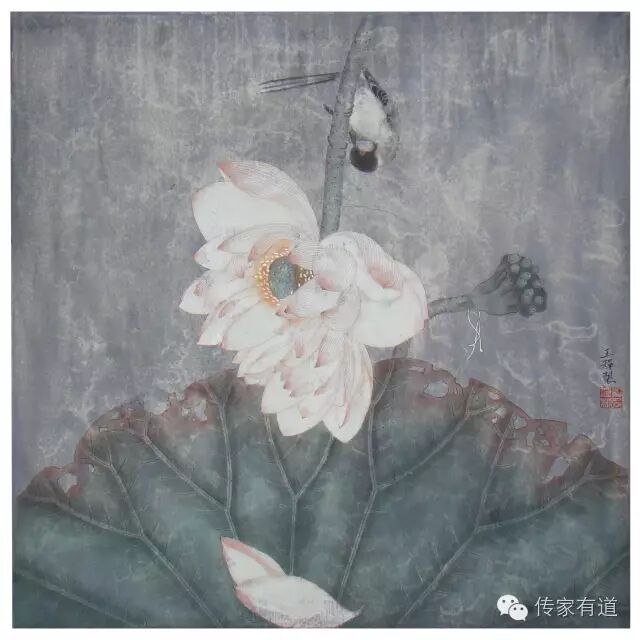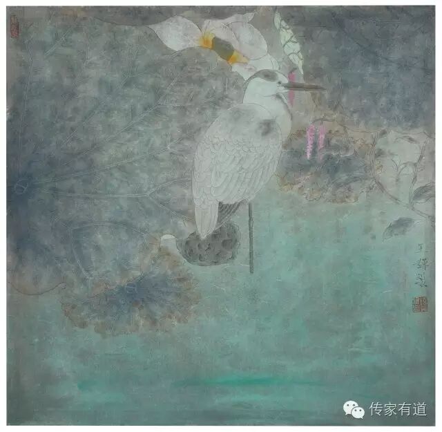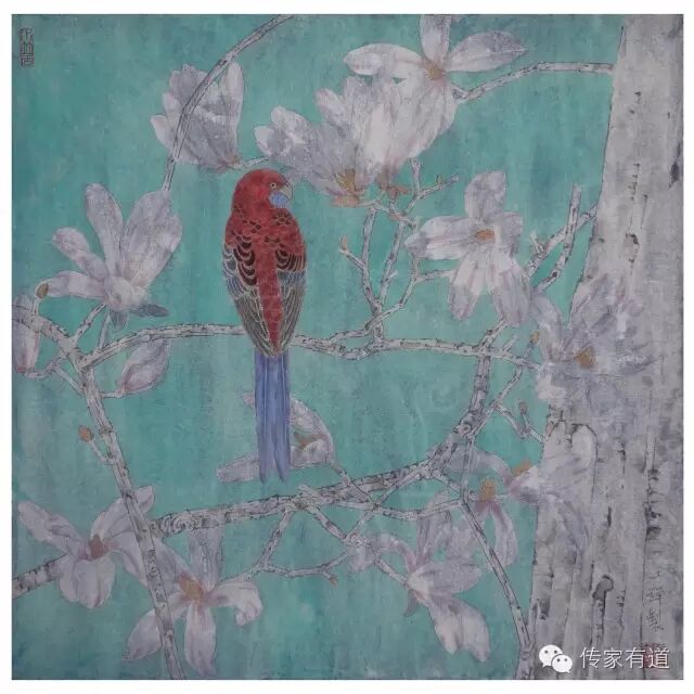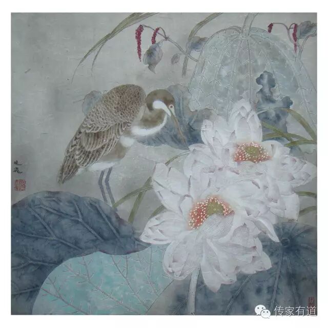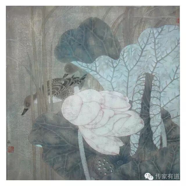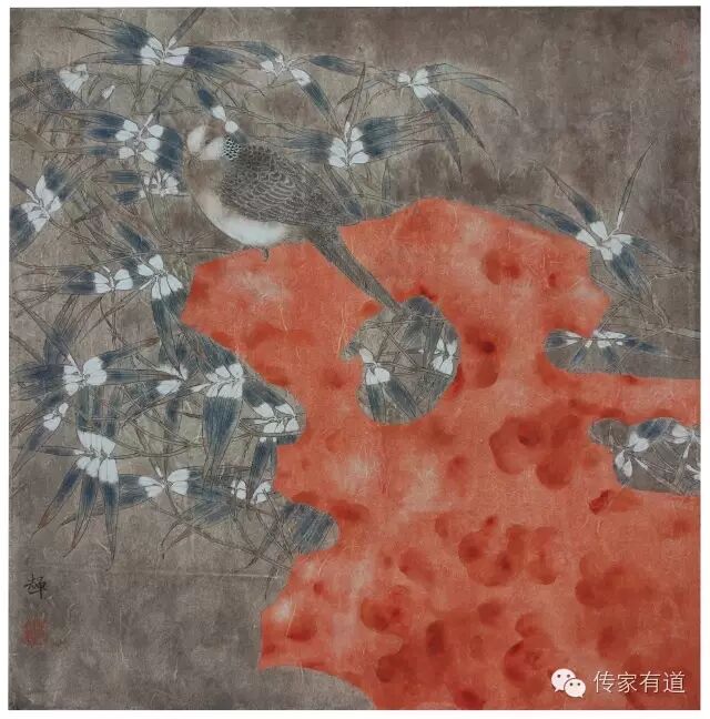 花鸟画的创作中他偏爱层层叠叠的色彩,反复的刷洗,让色彩的细微光泽慢慢的渗透于纸张的纤维中,花草优美柔弱的形态融合在灰雅的调子里。