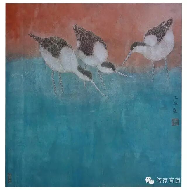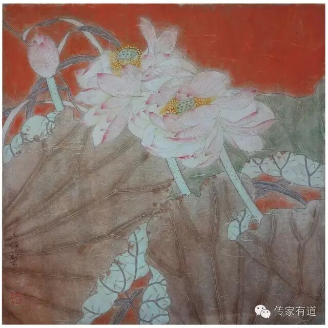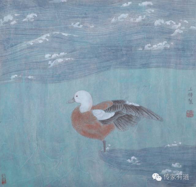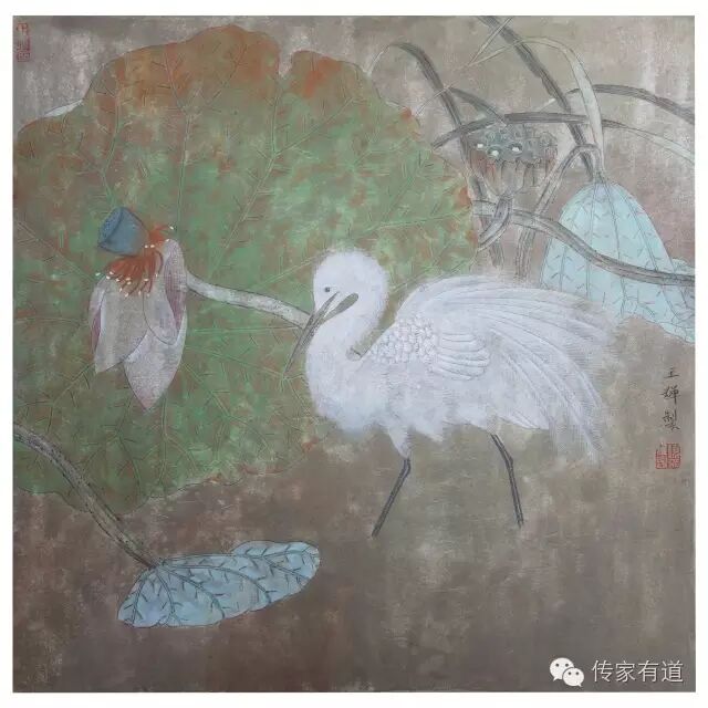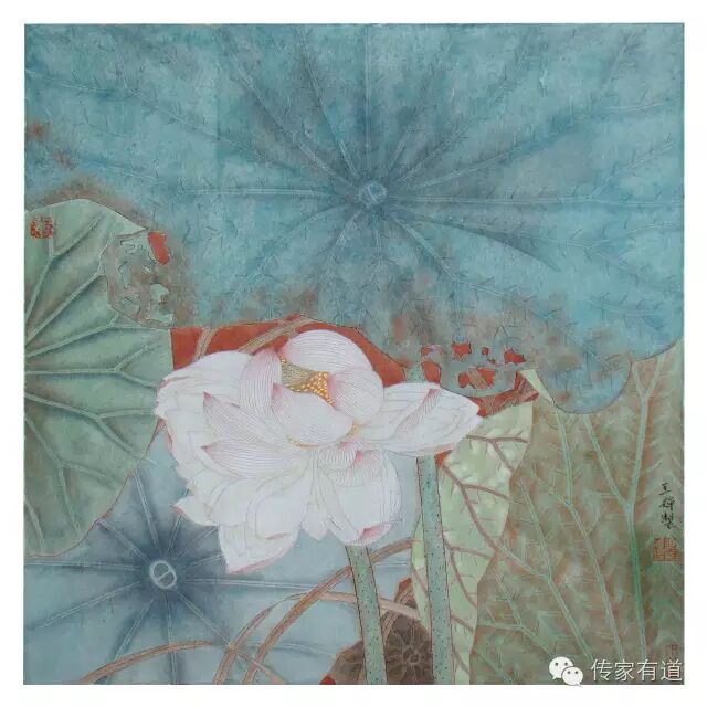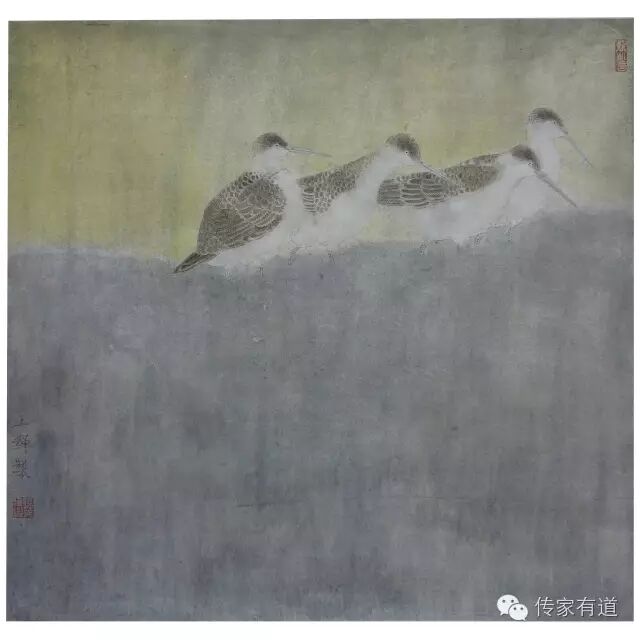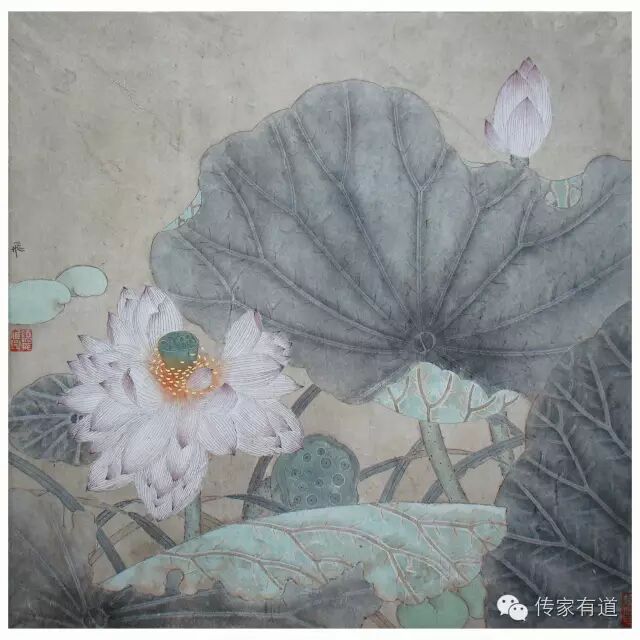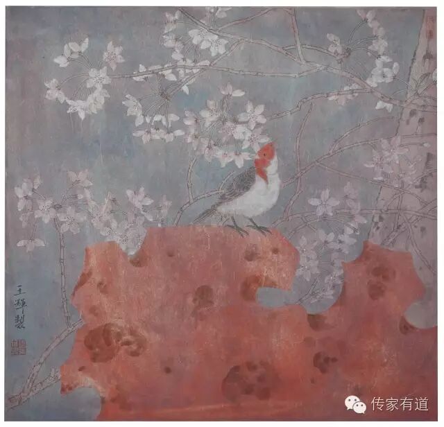 花鸟画的创作中他偏爱层层叠叠的色彩,反复的刷洗,让色彩的细微光泽慢慢的渗透于纸张的纤维中,花草优美柔弱的形态融合在灰雅的调子里。