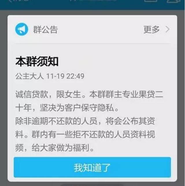 昨天,记者根据邢天提供的相关信息,进入“校园贷”群,该群公告显示“本群群主专业果(裸)贷二十年,坚决为客户保守隐私。除非逾期不还款的人员,将会公布其资料。群内有一些拒不还款的人员资料视频,给大家做为福利。”