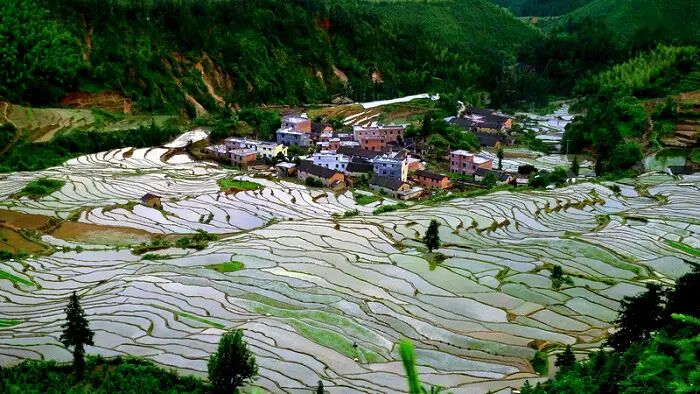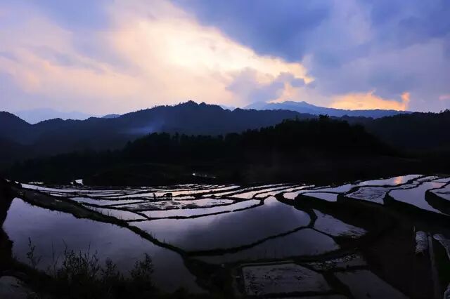 5—7月:正值欧家梯田春耕时节,梯田上的耕犁开始忙碌起来,梯田犹如一片片明镜,映衬着每一天“不同的”朝霞与夕阳,形成一个色彩斑斓的天堂。