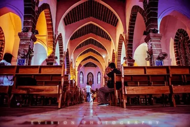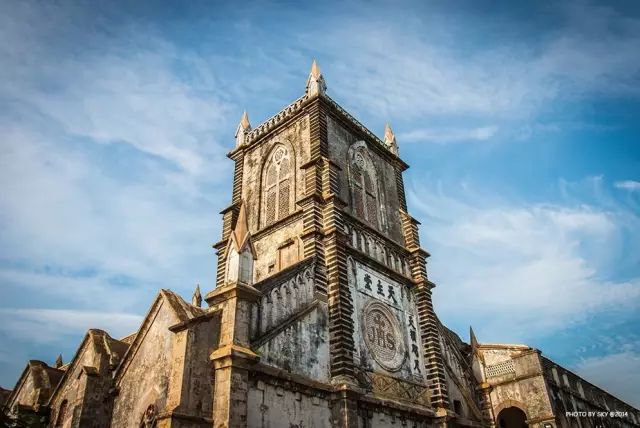 高大雄伟的天主堂,在四周低矮民居的衬托下,显得规模庞大,颇有气势。正门顶端是钟楼,高耸着罗马式的尖塔,有着随时“向天一击”的动势,造成一种“天国神秘”的幻觉,堪称别具一格。