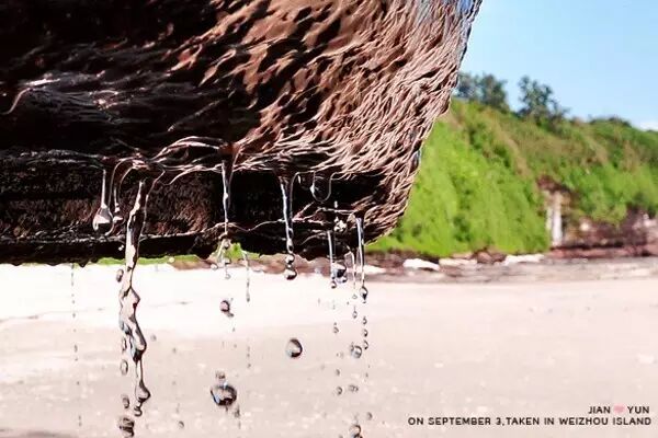 滴水丹屏位于涠洲岛滴水村南岸边,原名滴水岩。绝壁上部绿树成荫,壁上层间裂隙常有水溢出,一点点往下滴,如朱帘垂挂。由于海蚀作用,岩石的外表形态犹如一有眼、有鼻、有嘴、有发的巨型侧面“人头像”(现已倒塌),景致优美。