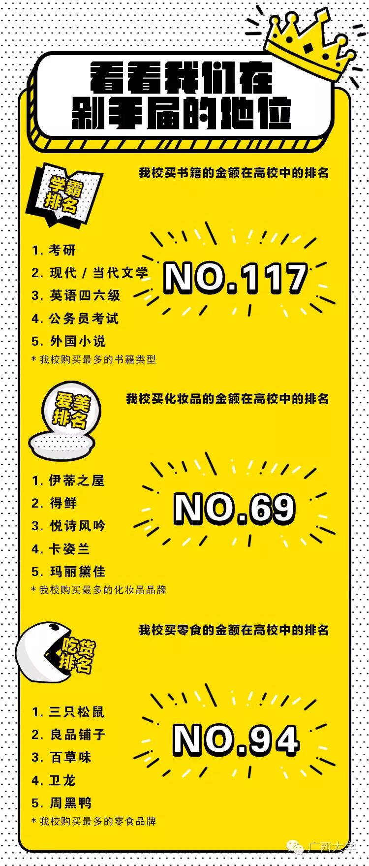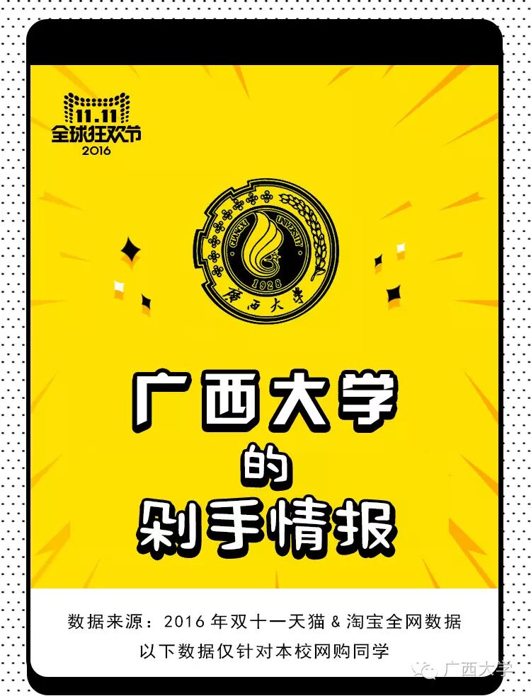今天,我们联合阿里巴巴集团,掌握第一手资料,独家发布广西大学“双十一”剁手报告,跟小西一起来看看,GUXer在“双十一”这天怎么买买买的