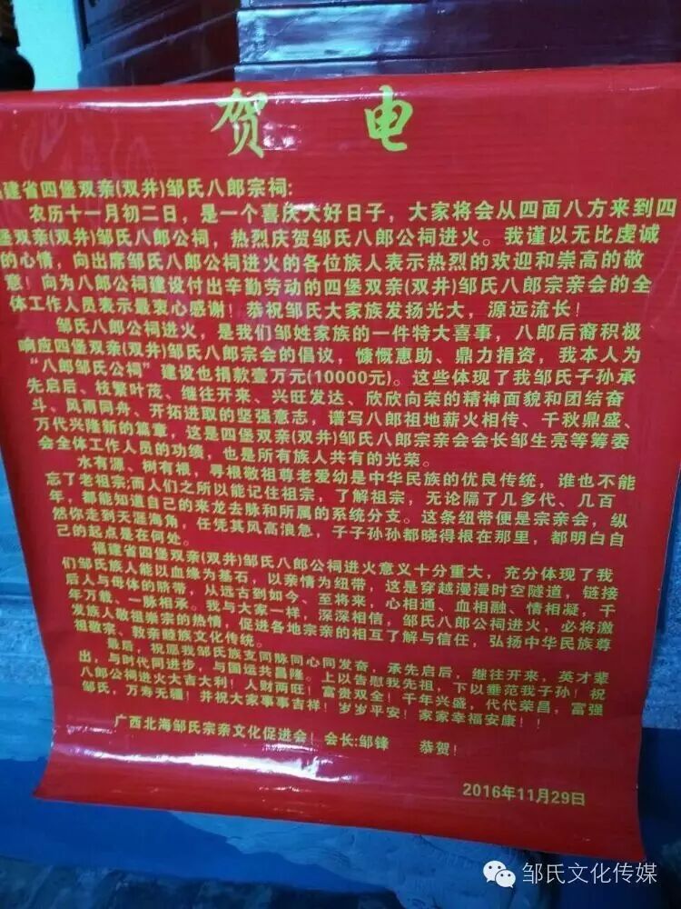 邹氏八郎公祠今天立牌进香庆典是我们邹姓家族的一件特大喜事,八郎后裔积极响应四堡双泉(双井)殿邹氏八郎宗会的倡议,慷慨惠助、鼎力捐资,我本人为“八郎邹氏公祠”建设也添砖加瓦、这些体现了我邹氏子孙承先启后、枝繁叶茂、继往开来、兴旺发达、欣欣向荣的精神面貌和团结奋斗、风雨同舟、开拓进取的坚强意志,谱写八郎祖地薪火相传、千秋鼎盛、万代昌隆新的篇章,这是四堡双亲(双井)邹氏八郎宗亲会会长邹生亮等筹委会全体工作人员的功绩,也是所有族人共有的光荣。