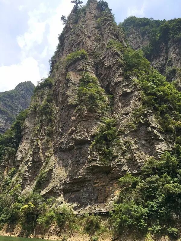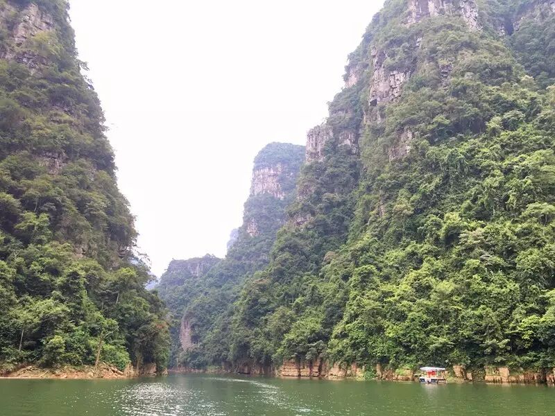 两岸高耸的山峰和奇峰怪石,流泉飞瀑尽收眼底,青翠欲滴的山坡上,猴群时隐时现。