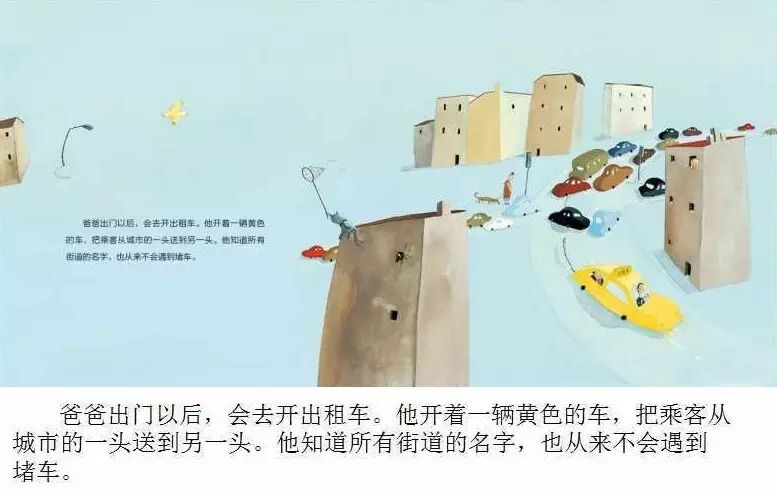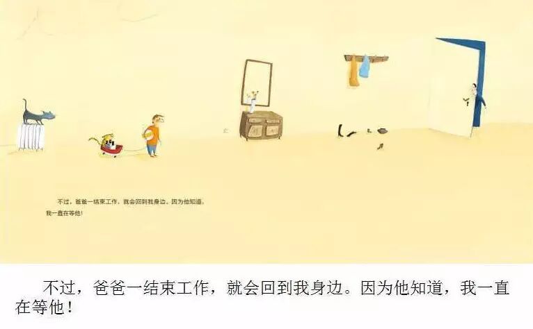 这本书里边没有过多的诉说父子间的思念,没有让失落和孤单充斥着画面,而是充满着对爸爸的敬仰和自豪。因为父子之间浓浓的亲情和深深的眷恋,让他们对彼此充满着信心,爱的执着让家变得更具有吸引力,爱的自信能够消解分别的愁绪。这就是伊莎贝尔解决父子分离之苦的一剂良方。