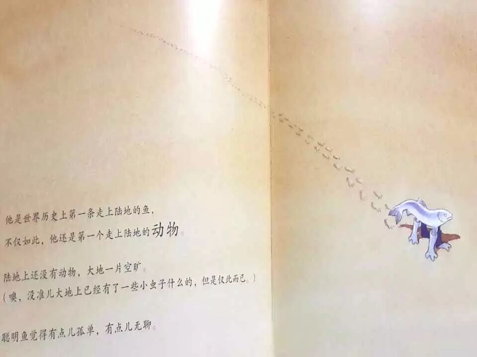 这本书,是关于一条聪明的鱼的,一个改变世界的想法的产生、思考,并且付出行动,最终改变世界的故事。这是这本书的主线,那么这本书的副线是简明的一个物种的进化。之所以这么说,是因为在孩子的世界里,充满着各种各样稀奇古怪的想法和想象,怎么去正确地看待和对待这些想法和想象呢?使孩子内心所渴望的具有普适性。但是呢,物种进化对于孩子来说属于比较难理解的知识,于是呢,作者就借此阐发,对想法的思考,有一个有趣的载体,这并不是作者的主要的目的。