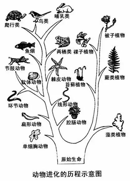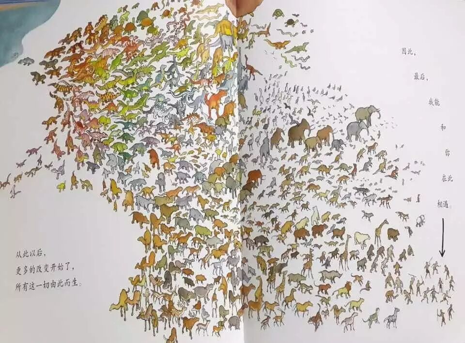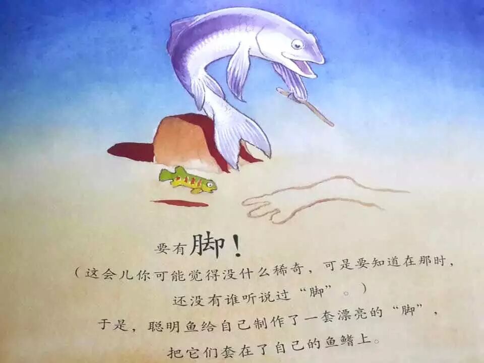 这本书啊,虽然是给孩子看的绘本,但是作者对于生物进化史了解很深,态度也非常严谨聪明。用鞋子走路当然是虚构的,但是由于用鳍走路,最后进化为爬行动物中的四肢,是完全符合生物学的研究发现的。而在鱼类上陆地之前,陆地上可能已经有了虫类,究竟鱼类是不是最早上陆地的动物呢?科学家没有定论,所以作者在文字表示的时候是很严谨的。他说:“还是第一个走上陆地的动物哦,噢,没准大地上已经有了一些小虫子什么的。”但是仅此而已,没准这个句子呢!就是添上去以后,能够让我们的孩子潜移默化的养成严谨的科学观。这幅图可以看到密密麻麻的一群动物,但是一定要仔细地观察,因为作者可是一点都不乱,反而非常非常精确。从左上方到右下方,是脊椎动物进化的大致历程啊,原始鱼类到原始两栖类,到原始的爬行类,到原始鸟类和各种哺乳类,最后是人类。