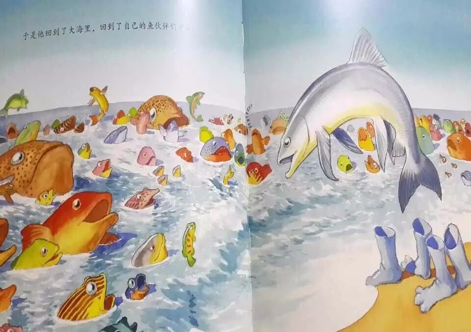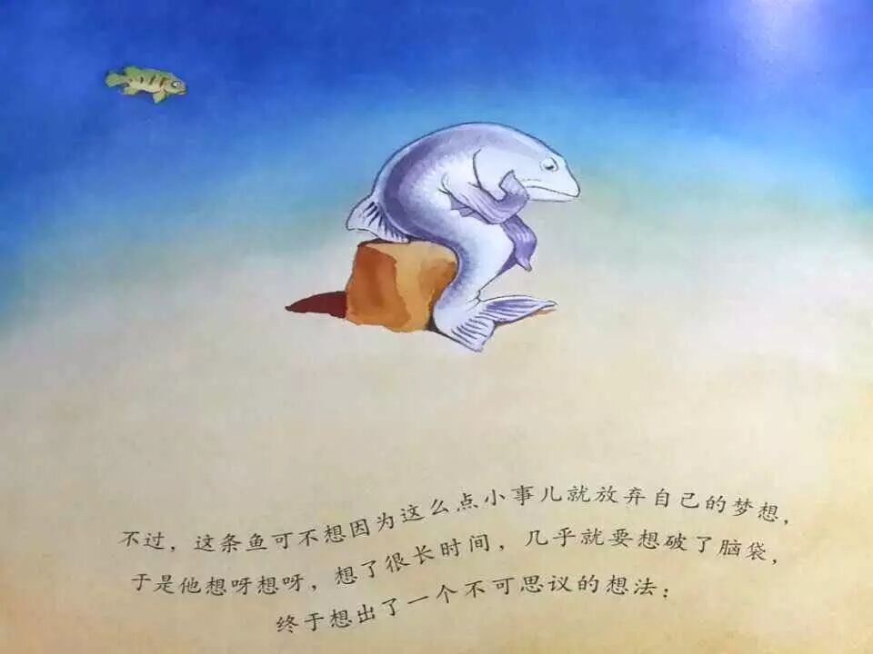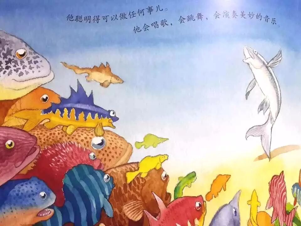 后边的十六十七页才是画龙点睛、升华经典之笔。聪明鱼成功以后,并没有因为之前是独自一个人努力而放弃了群鱼。他重新回到了海里,告诉了他的伙伴们,引领着他的伙伴们前行。其实这个世界是温暖的,虽然自己的想法可能不被同伴所理解,但是同伴还是一样会关爱着自己,而自己的想法也不是为了利己,而是出于对世界的好奇和对真理的追求,最终是为了整个鱼类。不被同伴暂时的不理解,而蒙蔽了自己对世界的信任,不会因为缺少同伴的支持而抱怨,甚至仇恨同伴,这才是一条真正的睿智的聪明的鱼。
