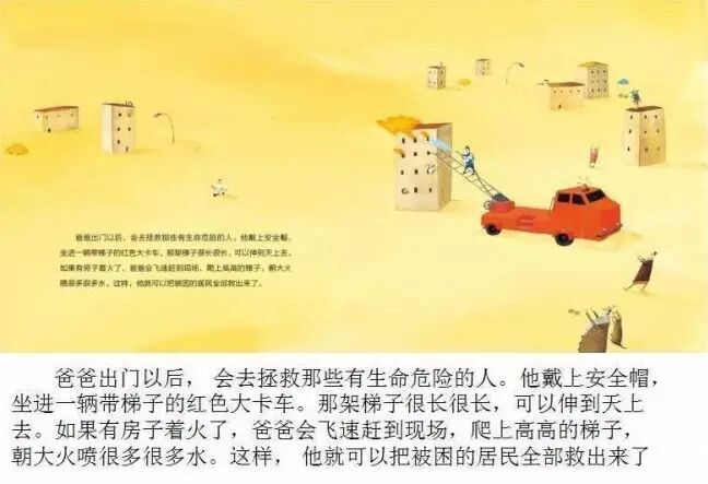 我们接着看这本书,无所不能的爸爸给孩子提供成长的正能量。在我们的小学低段里边,有很多关于爸爸的一些绘本。弗洛伊德说过,孩子在3岁左右开始与母亲的关系分裂开来,把一大部分的情感会投向对父亲的关系上,会倾慕敬仰自己的父亲,无时无刻不拿父亲当榜样来学习他的优点和习惯。所以这阶段的孩子心中的父亲的形象都是伟大的,这种伟大的形象鼓励并支持着儿童的独立和自由,有利于个性的发展。这本书当中的小男孩借助于爸爸无所不能的表现来实现了自己对职业的这种精神的扮演,使自己对爸爸的思念和对大人职业的未知以及自卑得到了补偿和和示范。