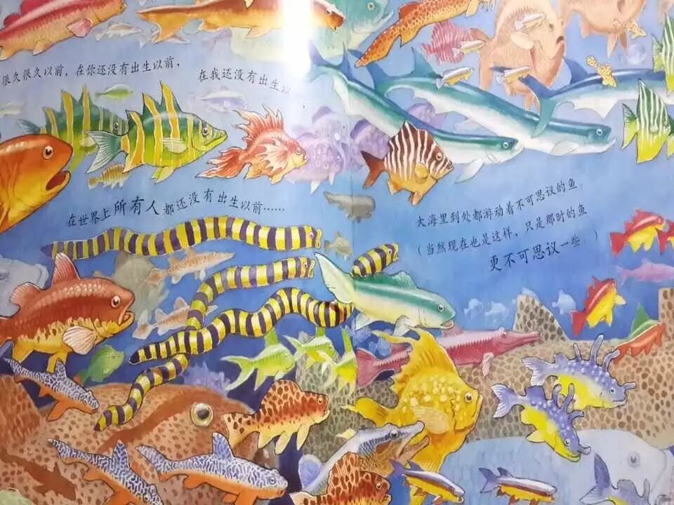 我们接着来读故事,故事的前面几页交待了背景,请看我刚才出示的画面,请注意作者写的句子,“在很久以前,在你还没有出生以前,在我也没有出生以前,在这个世界所有人都没有出生以前”……这段文字呢?它不是重复累赘的,而是层层递进的。我们都知道,孩子的认识是具体的,是渐进的,是由熟悉到陌生的。所以,如果说很久以前,孩子是没有概念的。通过熟悉的你,再到熟悉的我,再到陌生的所有人,这样的层层推进,时间就一点点的拉长,就像镜头一样在延伸。最后呢,让孩子对很久以前有一个形象的量的概念,同时通过语句的重复延长,也营造了一个无限久远的时代;有了一种神秘感,让孩子充满着期待。同时还描绘了美丽的奇幻的海洋世界。