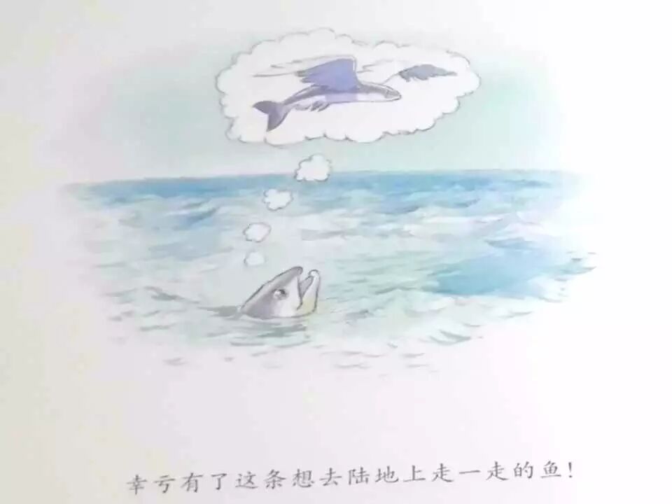 聪明鱼也一样,他想上岸,到陆地上去探索世界,被鱼不能走路所难倒了。但是他并没有退缩,他继续思考,直到想到了一个好主意,他给自己做了一个脚丫的鞋子,终于走上了海滩,成为第一个在陆地行走的鱼。读到这的时候,真的很激动,到目前为止,这是一个典型的逆袭的故事。虽然让我们喜欢,但是还达不到让我们感动的程度,接下来我就跟大家分享后边的点睛之笔。