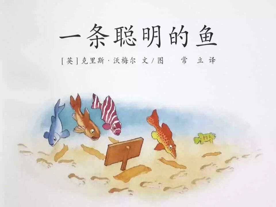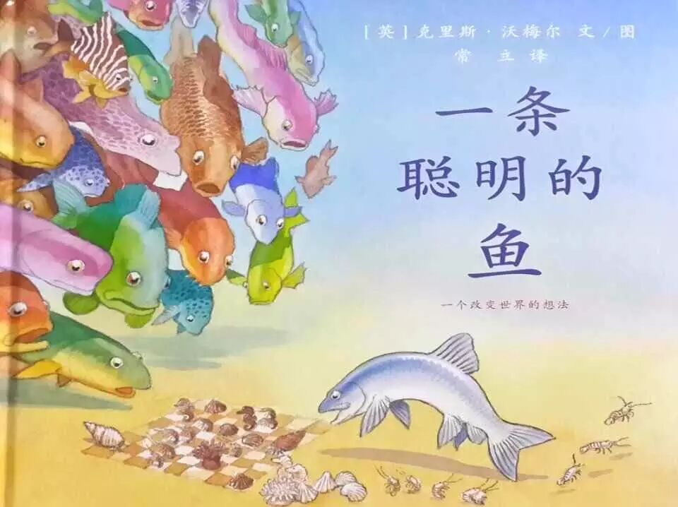 我们先来看这张图片,这是《一条聪明的鱼》的封面。看着这个封面,我们要知道,首先它有两个标题。主标题是《一条聪明的鱼》,副标题是《一个改变世界的想法》。其中,副标题在原版当中是没有的,应该是翻译者把它加上去的。那么为什么要加这个副标题呢?译者也许是想让我们读者更清晰地明白,这本绘本的主旨在于对想法的思考。