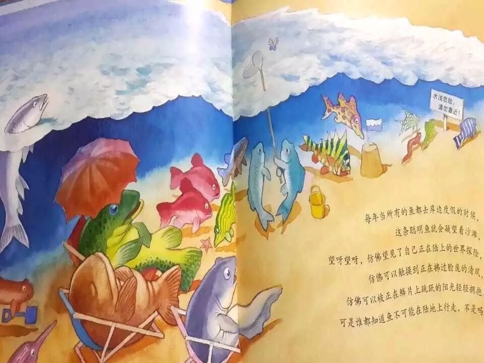 从这几张图片可以看到,聪明鱼虽然在热闹的氛围中,但是他的想法是特立独行的,精神世界是孤独的,作者同样进行了对比的处理。大家可以看到群鱼在温暖的黄色的沙滩上快乐地度假,而我们的聪明鱼,却在冷静的蓝白色的海水边独自思考。聪明鱼是独立而行的,他是孤独的,这是符合现实的。其实我们现实生活中不也是这样吗?超前的想法是得不到响应的,甚至可能会被误解。有主见的鱼必须独立而行,认真而周详地去思考,并且勇敢地去尝试,往往等自己的想法得到验证以后才会被大家所接受。这时候我们所说的自由,思想的独立之精神就非常的重要了,所以既要让孩子明白,爱是无处不在的,也要让孩子知道,有些想法,大家暂时可能无法接受,但只要你认为是对的,那么就大胆地去尝试坚持内心的想法,不管成功与否,都是一次成长,就像大家所熟悉的名人故事。只要有想法肯思考,并且坚持不懈的去实践,往往都能获得成功。