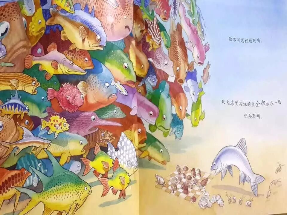 那么下棋为什么会让这群鱼都震惊呢?我们来想一想,下棋的人都聪明,20年前国际象棋大师就是和计算机来通过国际象棋比赛来分辨出谁聪明的。在去年3月份啊,我们的围棋大师李世石就和计算机进行了围棋的人机大战,来比较人和计算机哪个更聪明。下棋的人都很聪明,聪明的人都会下棋。对比的方式,就是这本书的一个重要手法。大家来看,左边的这群鱼呀,是艳丽奇特,合群热闹。但是呢,他们安于现状,不热衷于思考,而聪明鱼呢,就是这个银白色的鱼呢?他朴实,朴素,普通,独立冷静,但是他勇于探索,乐于思考。作者通过颜色数量的对比,产生了巨大的视觉的反差,能够引发我们的好奇和思索,聪明鱼普通孤独。开始我们觉得他有一点点可怜,但是慢慢的,我们发现他是那么的聪明和勇敢,并且能够给鱼类带来革命性的变化,让我们由衷去敬佩他。