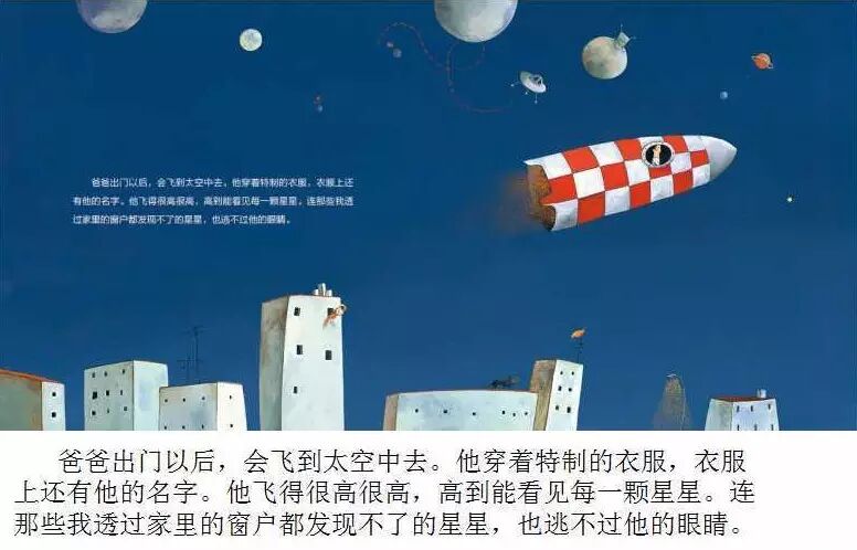 我们接着读故事。在3到13页里边描述了罗密欧对爸爸的职业的种种的想象。孩子思维还处于前运算阶段,属于具象思维的阶段,他们很难理解职业这一概念。作者通过罗密欧对爸爸在不同的工作岗位上的工作内容和环境的想象,透过这些文字和画面具体的介绍了不同工作的特点作用、以及人与人之间的合作等等,不但让孩子对爸爸的职业有了初步的认识,而且还能让孩子明白,每一种职业都有它的专业技能,能够让孩子树立职业自豪感。孩子们就知道爸爸不单单是这个家庭的一员,还是社会的一员,这个家需要爸爸,社会也需要爸爸。从而能够很好地向孩子解释,爸爸为什么必须工作,为什么必须短暂地离开,能够明白整本书孩子为什么有思念,但是不伤心了。