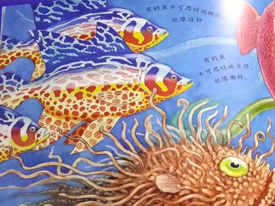 大家看,有各种各样的、艳丽的、奇异的鱼,一下子就能把我们的眼球给吸引住,相信孩子也是这样的。这本书能凝聚我们的注意力,我在班上也上了这节课,给孩子们聊了一节课的《一条聪明的鱼》。孩子们读得非常认真,他们发现了作者首先是通过色彩的丰富,蓝蓝的海水为背景,有红色,橙红色,黄色,绿色,五颜六色,五彩缤纷。其次是通过各种各样的奇特的形状,有胖的,瘦的,短的,长的,可爱的,恐怖的,还有充满着奇异感和神秘感的。通过各种各样的花纹和斑点,有青黄相间的呀,有绿黄相间,还有红黄相间圆斑的,花瓣的等等各种条纹和斑点,出乎我们想象的美丽和神奇。如此奇幻艳丽多姿的海底世界,真是让我们流连忘返,欲罢不能。