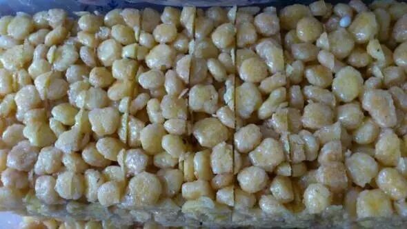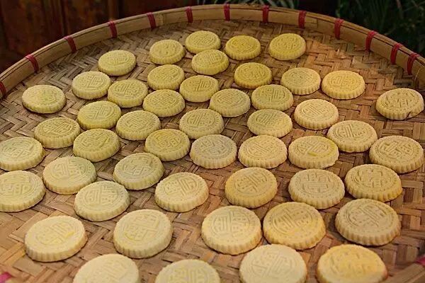 米饼以籼米、糯米、花生、芝麻、白糖等为原料,炒制磨粉制作而成,广西多地以此为小年节庆食品。