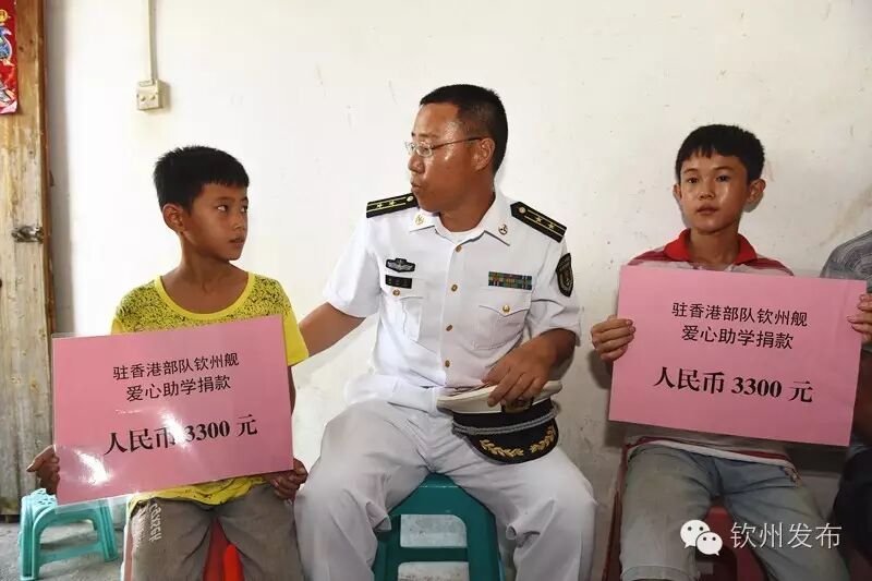 2014年10月,驻香港部队“钦州舰”全体官兵通过个人集资方式,筹集了4万多元给予钦州6名孤儿帮助。从2015年初开始,官兵们通过直接汇款的方式,每学期开学前,定期给这6名孤儿资助2500元至3500元不等的学费。