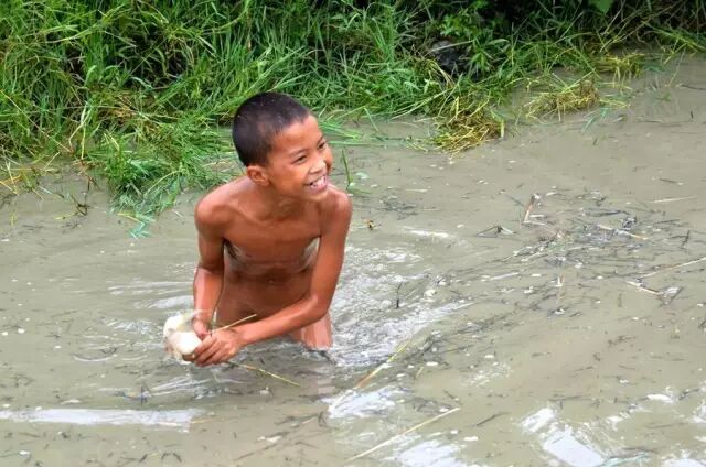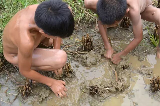夏天在田里抓鱼,