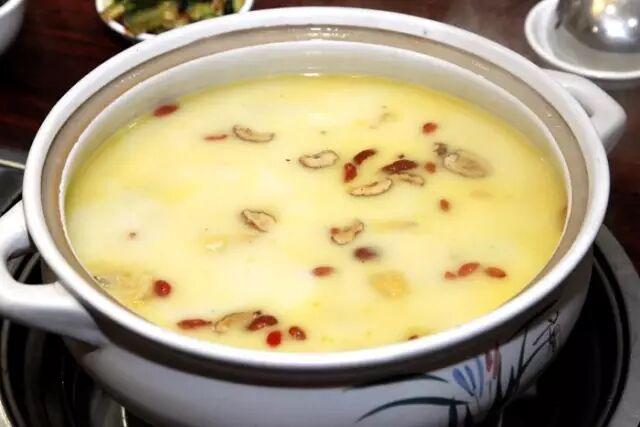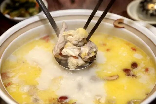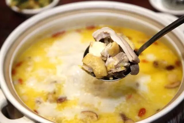 在这里,猪肚鸡作为招牌菜之一,是这个冬天每桌客人必点的菜式。鸡肉的鲜加上猪肚的香以及养生食材和熬制猪骨汤底,光看就已经流口水了。