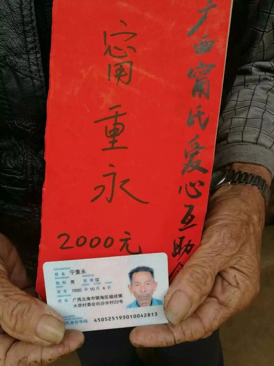 以科到了北海,,把宗亲们辛苦筹集的钱送到了甯重永宗亲手里!老人手里拿着爱心互助会所有会员及广大爱心宗亲送来的钱,心中无限感慨!这个做过几十年生产队队长的老人,曾经也意气风发,,从未有过私心,也是晚年有福报,看到甯氏后生这么关爱,关心族宗宗亲,无限欣慰的同时,千言万语也是尽在不言中了!