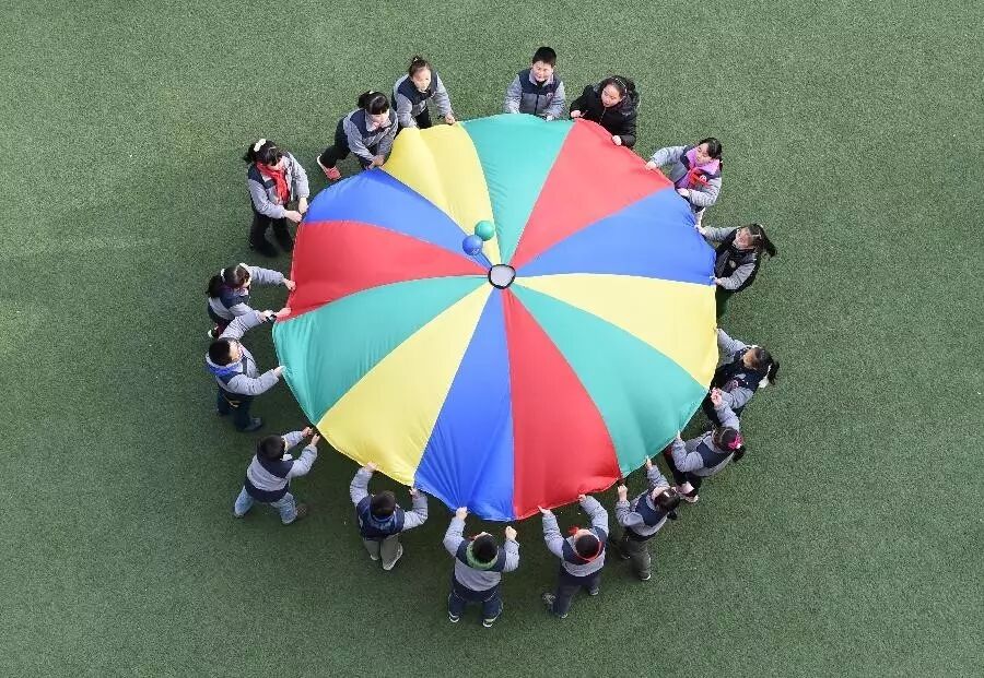 2015年3月11日南京市游府西街小学在三年级试点推行的体育教学改革“跑班上课”正式开课,游戏项目组的学生在做“彩虹伞”体育游戏。