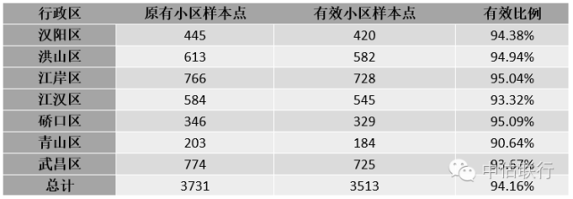 武汉国佳现有数据库中武汉中心城区共计3731个存量住宅楼盘,考虑小区数据的真实性,对楼盘进行分类筛选,将已拆迁、面年内临拆迁以及地址不明的楼盘进行剔除,选取有效样本点数据共计3513个,总有效比例为94.16%。