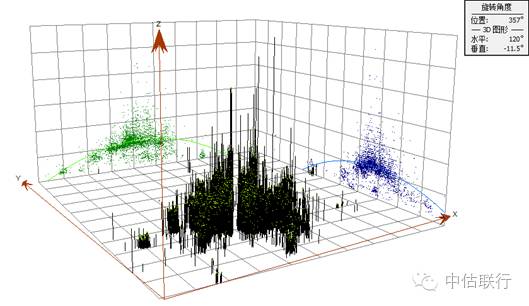 利用ArcGIS Desktop的Geostatistical Analyst趋势分析功能,为得到武汉市存量住宅基准房价空间全局趋势提供参考,如下图所示。从图中显示,存量住宅基准房价在东西、南北两个方向呈现倒U趋势,研究区域内基准房价总体从城市沿江中心区域向四周递减,存在较为复杂的二阶变化趋势。
