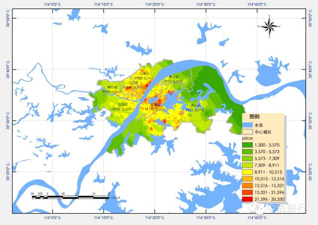 3、行政区之间价格区位差异明显,汉阳整体较其他城区房价偏低,武昌洪山区的白沙洲以及硚口区一号线西端在中心城区中位于价格洼地。