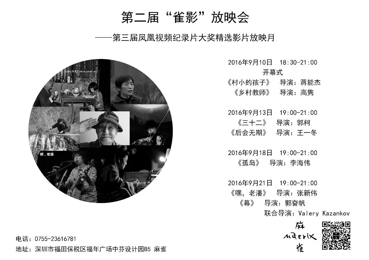 时隔半年有余,麻雀于九月发起第二次纪录片放映会。此次放映影片均为第三届凤凰视频纪录片大奖获奖或提名影片,题材涵盖社会遗留问题、教育、艺术、文化等多个内容。各位导演透过镜头真实记录了中国当今社会的各方面情况,表达了他们对这些问题的理解和情感诉求,让人在繁杂浮华的媒体内容叫嚣下,能静下心来体察不易被人察觉与关注的社会面。