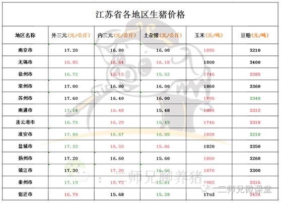 江苏省各市外三元生猪价格如下:最高苏州市17.60元/公斤,最低宿迁市16.65元/公斤,截止11月20号为止江苏省外三元生猪平均价格为17.03元每公斤左右。