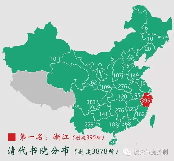 清代,由于官民两种力量的共同努力,书院进入前所未有的繁荣时期。清代共有书院4365所(因参考资料不同,也有一种说法推定实际为5000所以上),其中新建书院3878所,分布在如今31个省区,如下图: