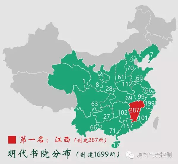 尽管总体情况仍是南多北少,但北移的态势还是很明显的,特别是山东超过南方很多省份名列第三亦可算例证。另外,北方书院占全国的比例,由宋代的3.75%飙升到22.63%也是重要的证明。 明代承前启后,在书院发展史上的地位十分重要。虽然明初因为推行程朱理学,书院有近百年的沉寂,但书院与王阳明、湛若水之学重新结合后,再度得到突飞猛进的发展,数量远远超过此前历代书院的总和,出现前所未有的盛局。明代共有书院1962所,其中新建1699所,分布在如今25个省区: